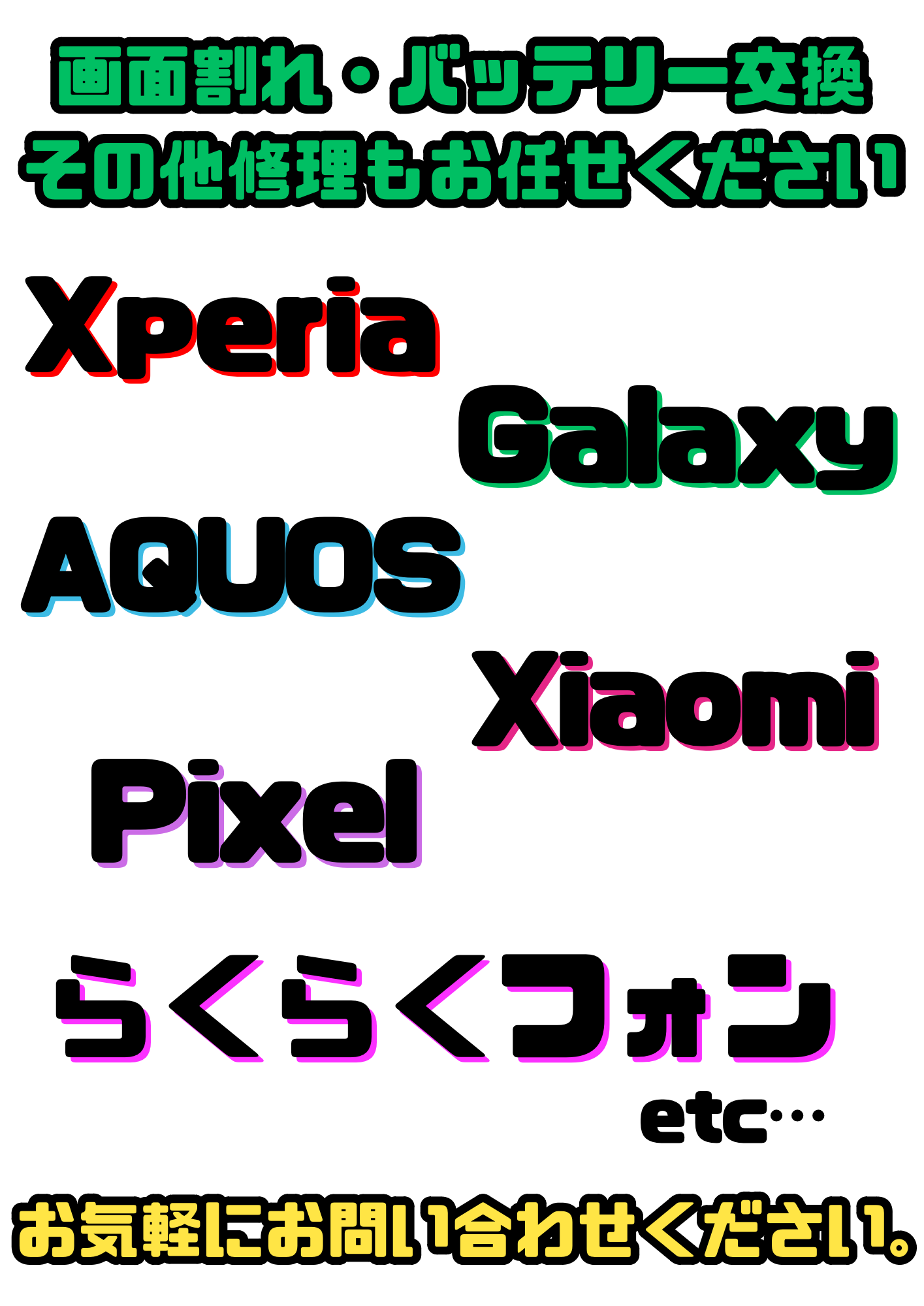 Xperia、Galaxy、AQUOS、Xiaomi、Google pixel、OPPO、らくらくフォンetc…